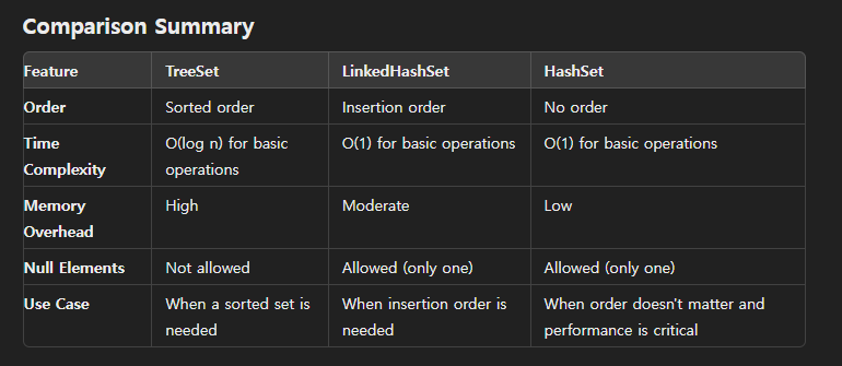 즉, 결론적으로 3가지의 Set은 상황마다 다르게 사용되며 간단하게 표로 표현할 수 있다.