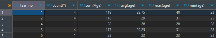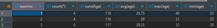 SELECT teamno, count(*), sum(Age), avg(age), max(age), min(age)