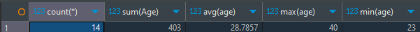 SELECT count(*), sum(Age), avg(age), max(age), min(age)