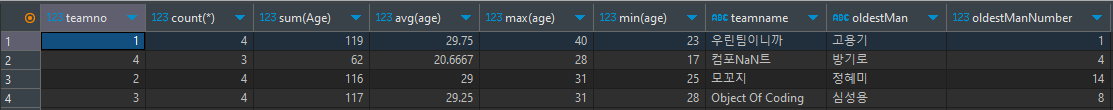 SELECT s.teamno, count(*), sum(s.Age), avg(s.age), max(s.age), min(s.age), t.teamname, s1.name, s1.studentno