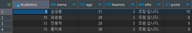 혹은 조 이름이 '모꼬지' 조의 조원 studentno, name, teamno 출력하기