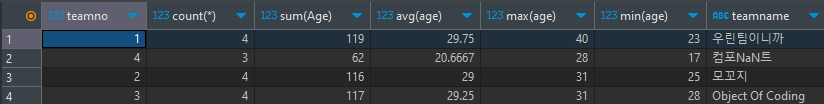 아래는 팀별로 나이에 대한 것을 통계낸 것이다.
